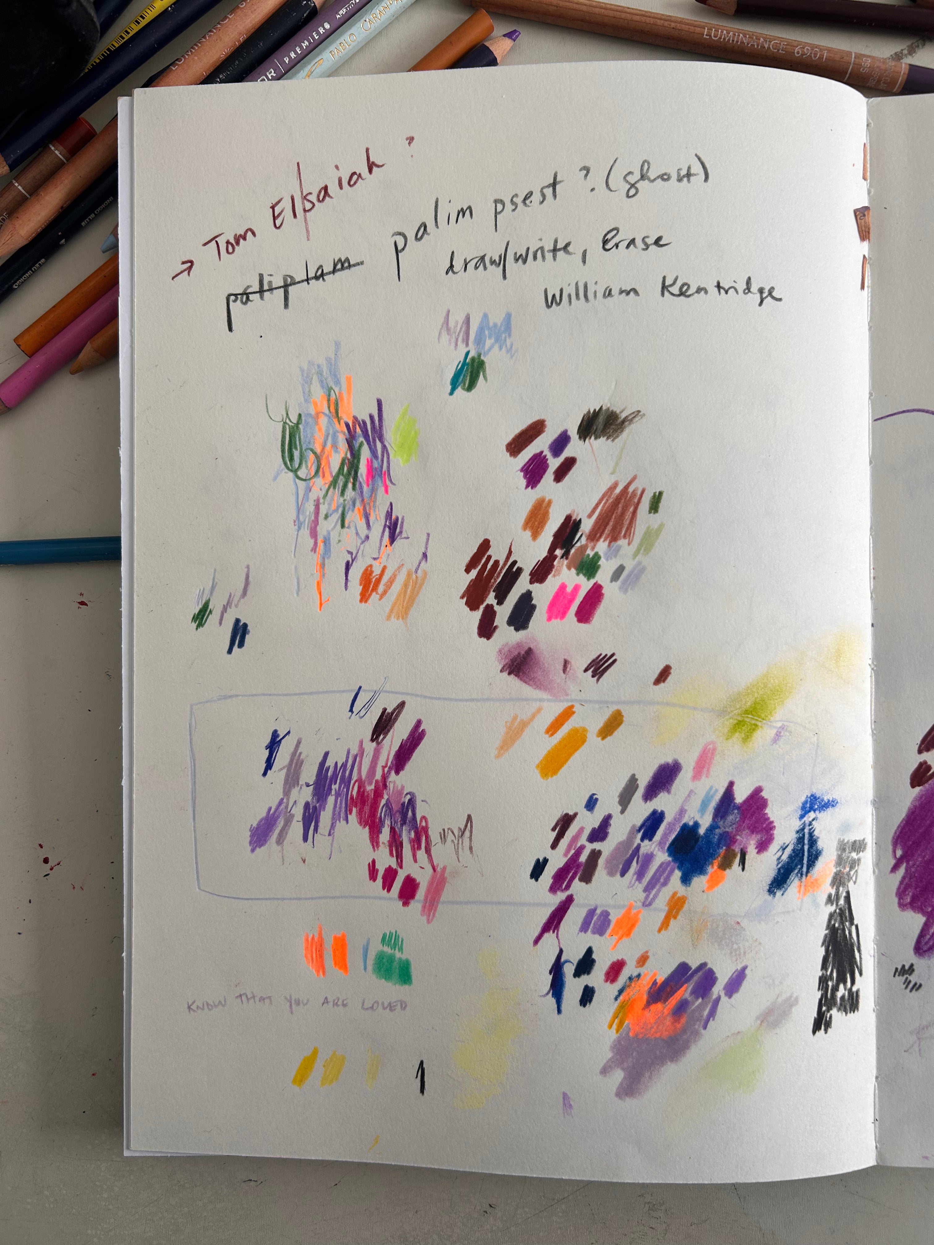 I start by using the colors we discussed. I always start with the lighter colors first. My hand move lightly across the page, carving out its own space.