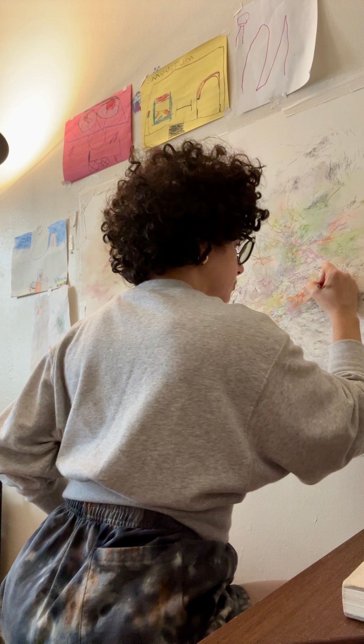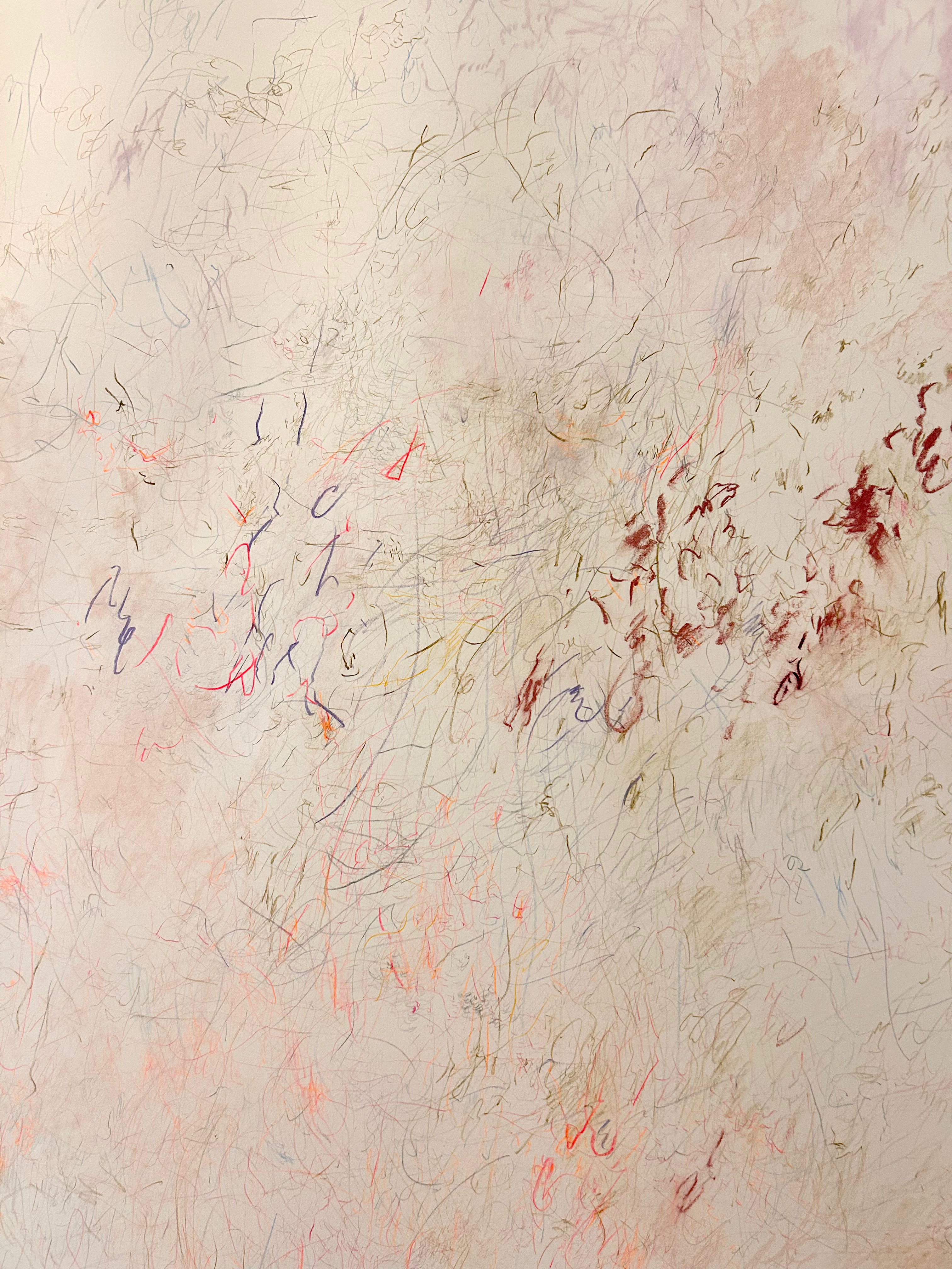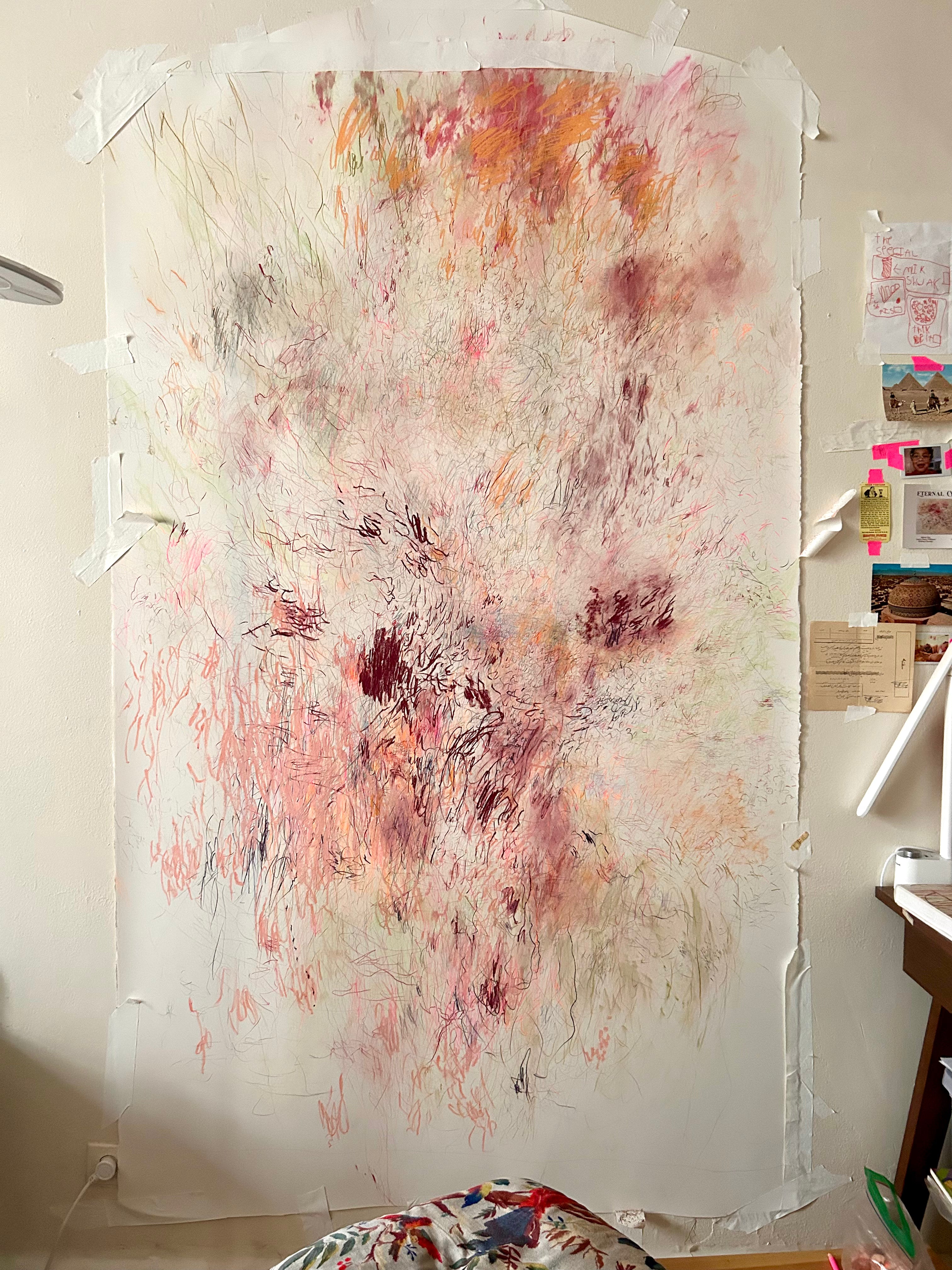 Once the color and line feel settled, its done! I take it off the wall and begin spraying the drawing with archival fixative. This sets the materials and keeps it from fading.
