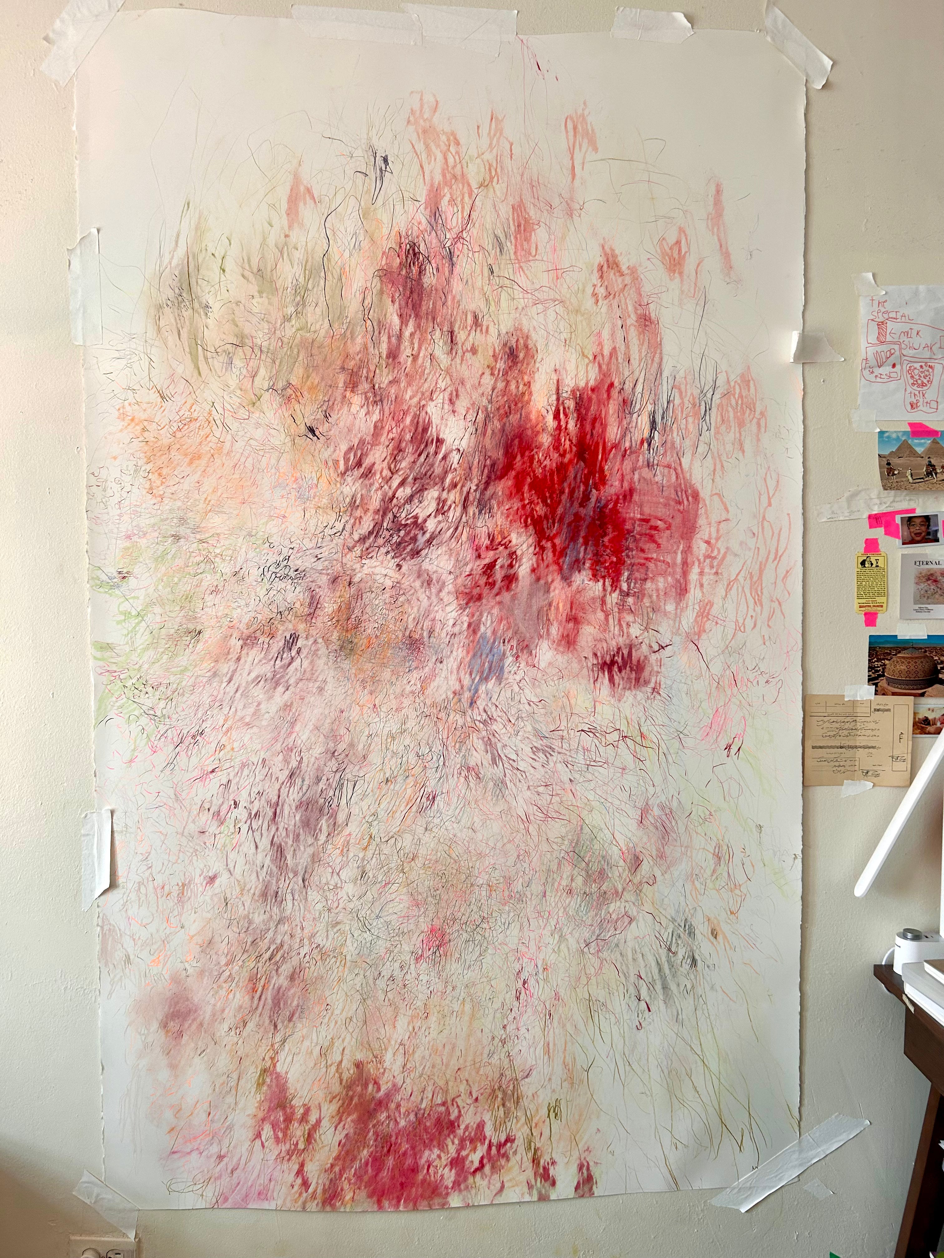 During the process, I will send you images and videos of the process. Once I start the drawing there is no giving direction, the lines and color direct themselves. Please keep in mind that the drawing will make many shifts in direction, which dont always determine the final result.